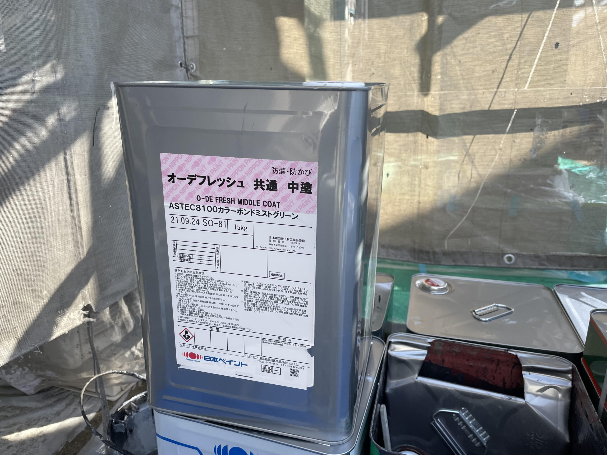 M様邸の外壁用の塗料は日本ペイントのスーパーオーデフレッシュFです。超低汚染性の塗料で汚れがつきにくかったり、ついてしまった汚れが雨などで流れ落ちやすいなどの特徴があります。高い防カビ防藻性能もあるので長期間にわたって『きれいが長持ち』してくれることが期待できますね。