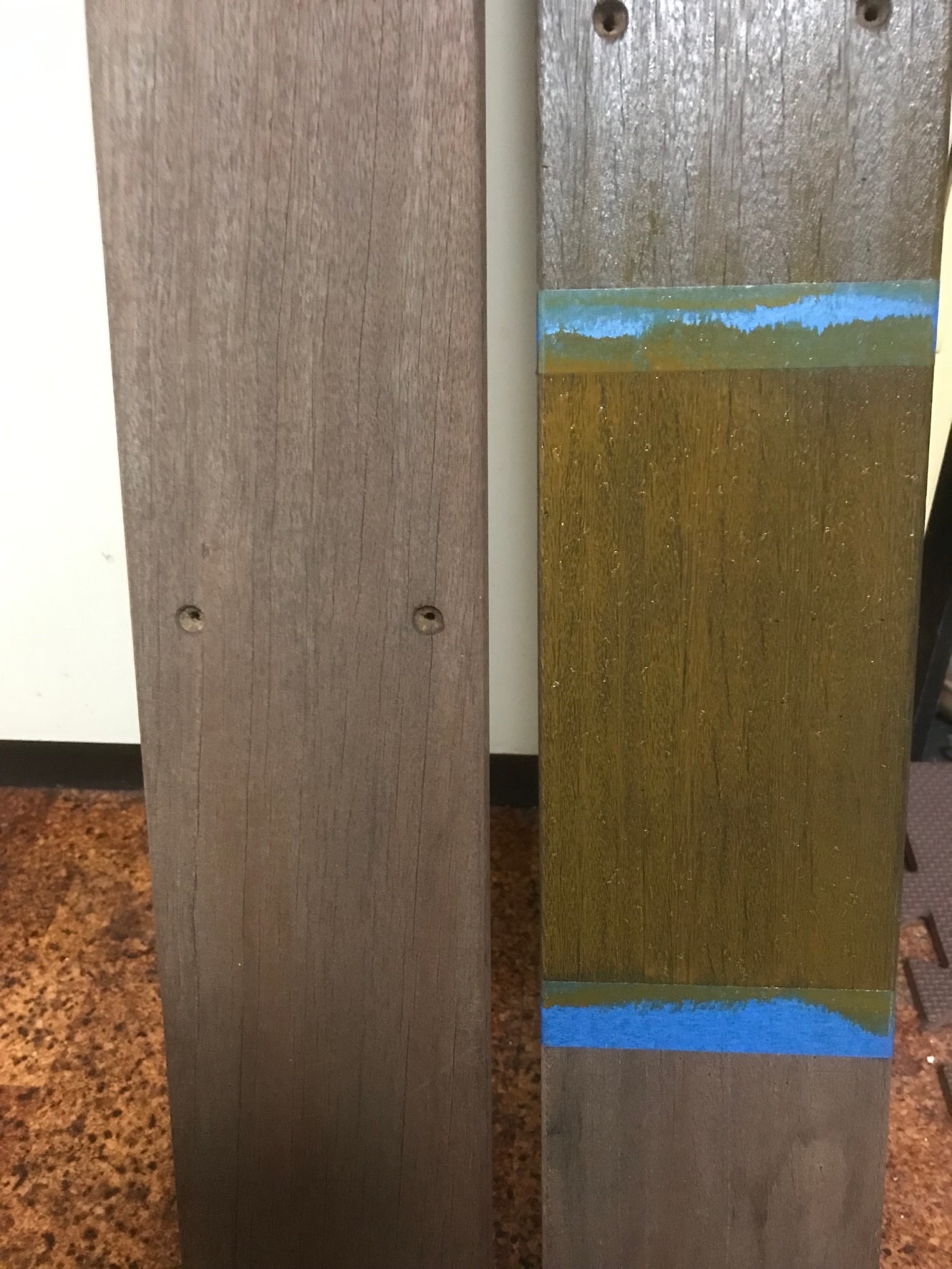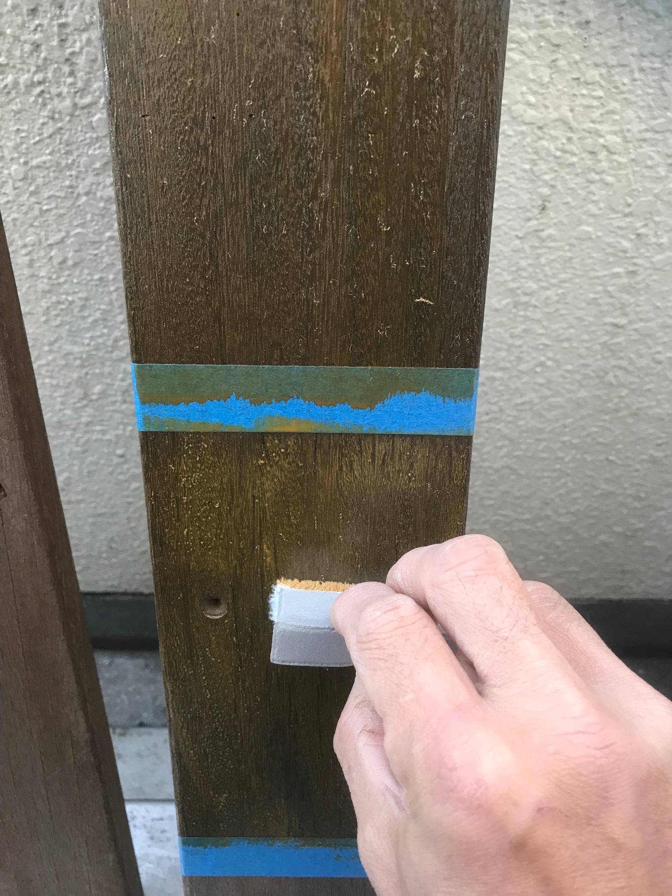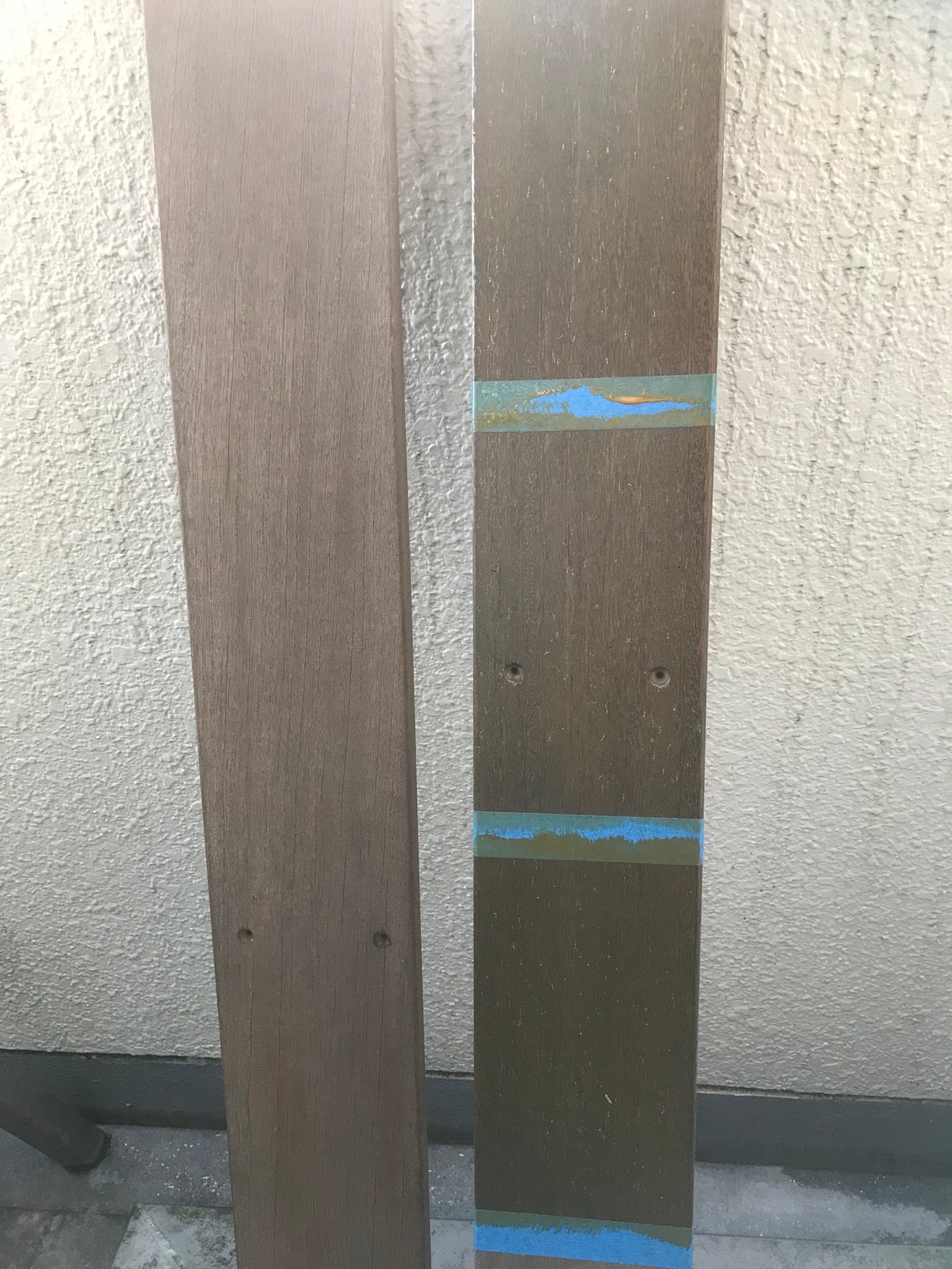 ウッドフェンスの色選びを行いました。 ステイン系の木部塗料は元々の木材の色や以前に塗装した塗料の色によって同じ色を塗っても見え方が違います。色の見本帳通りに色が出ることの方が少ないので、目立たない箇所で試し塗りを行なって施主様に選んでいただくようにしています。 完成した後にイメージと違っていたら残念な気持ちになりますもんね。 色選びも楽しみの一つです。